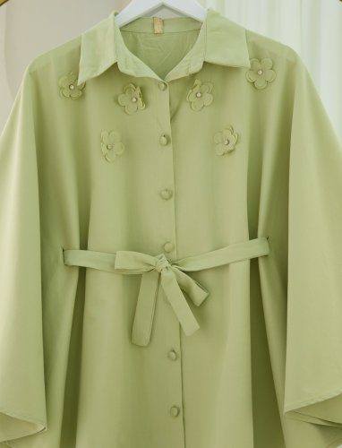 Önü Çiçek Detaylı Beli Bağcıklı Düğmeli Panço Çağla Y