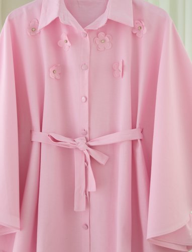 • Önü Çiçek Detaylı Beli Bağcıklı Düğmeli Panço Pembe