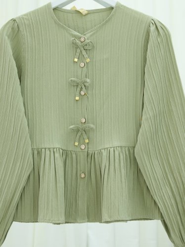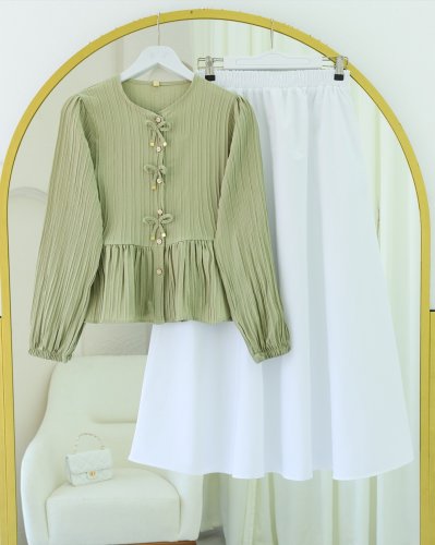 • Önü Fiyonk Detaylı Düğmeli Kolu Lastikli Bluz Çağla Y