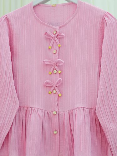 • Önü Fiyonk Detaylı Düğmeli Kolu Lastikli Bluz Pembe