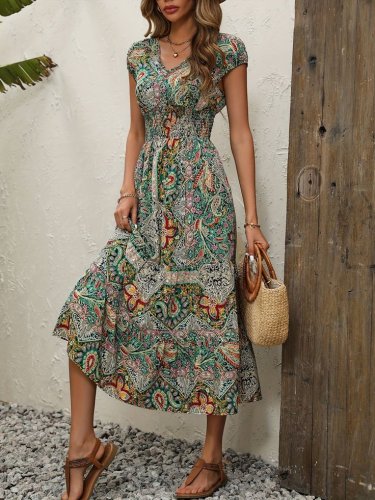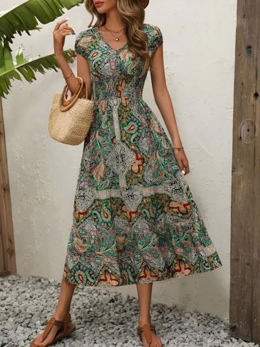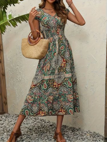 • Kadın kısa kollu çok renkli etnik desenli midi boy süprem elbise