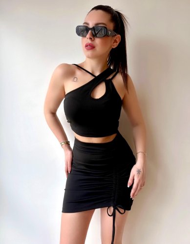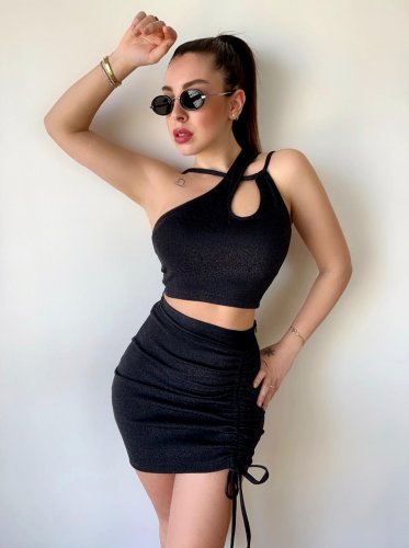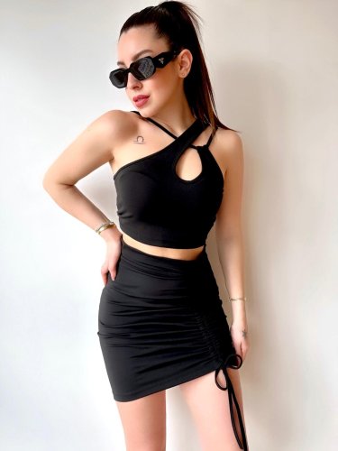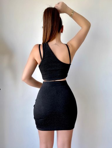 • Kadın asimetrik yaka detay crop ve yüksek bel mini etek ikili takim